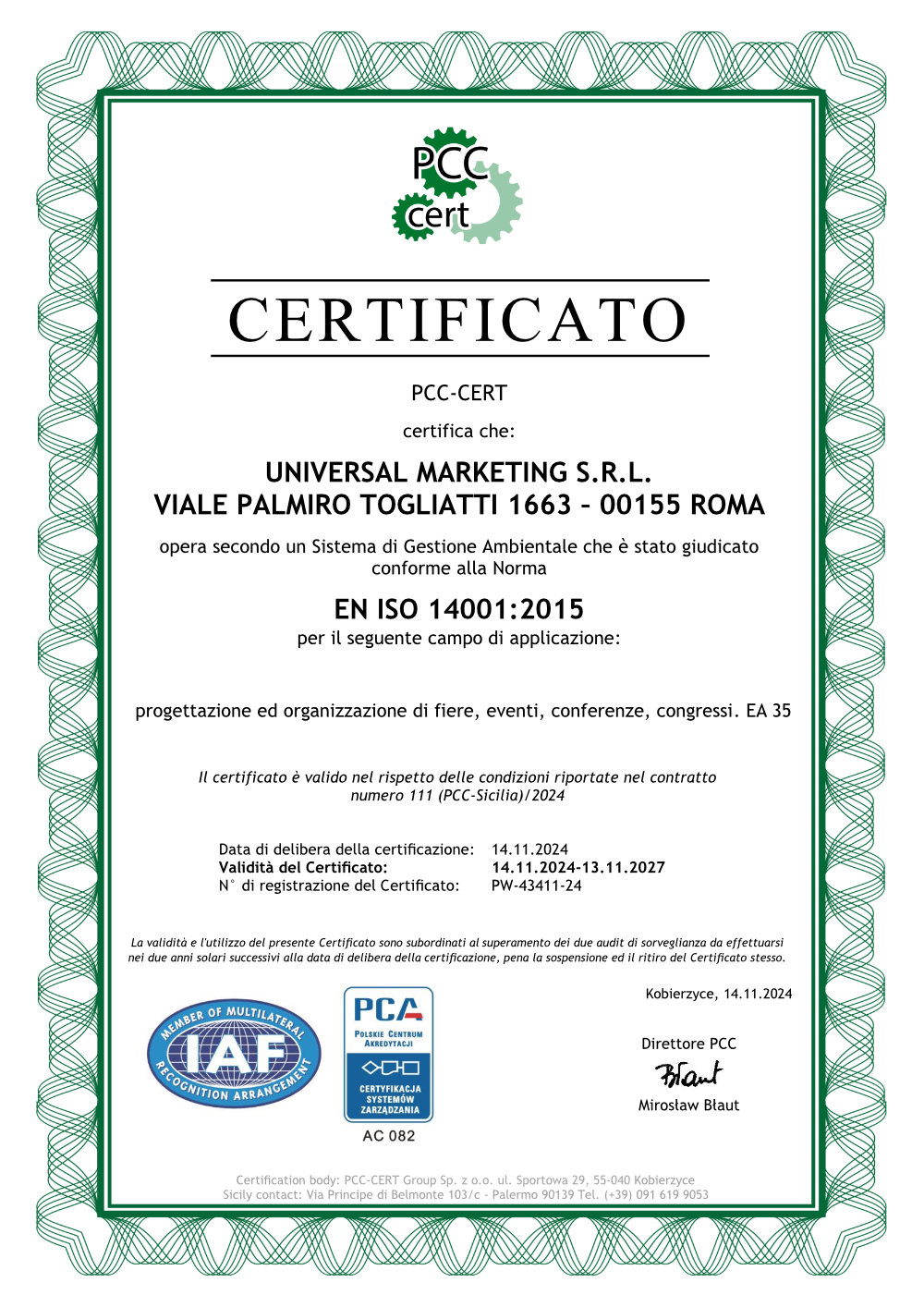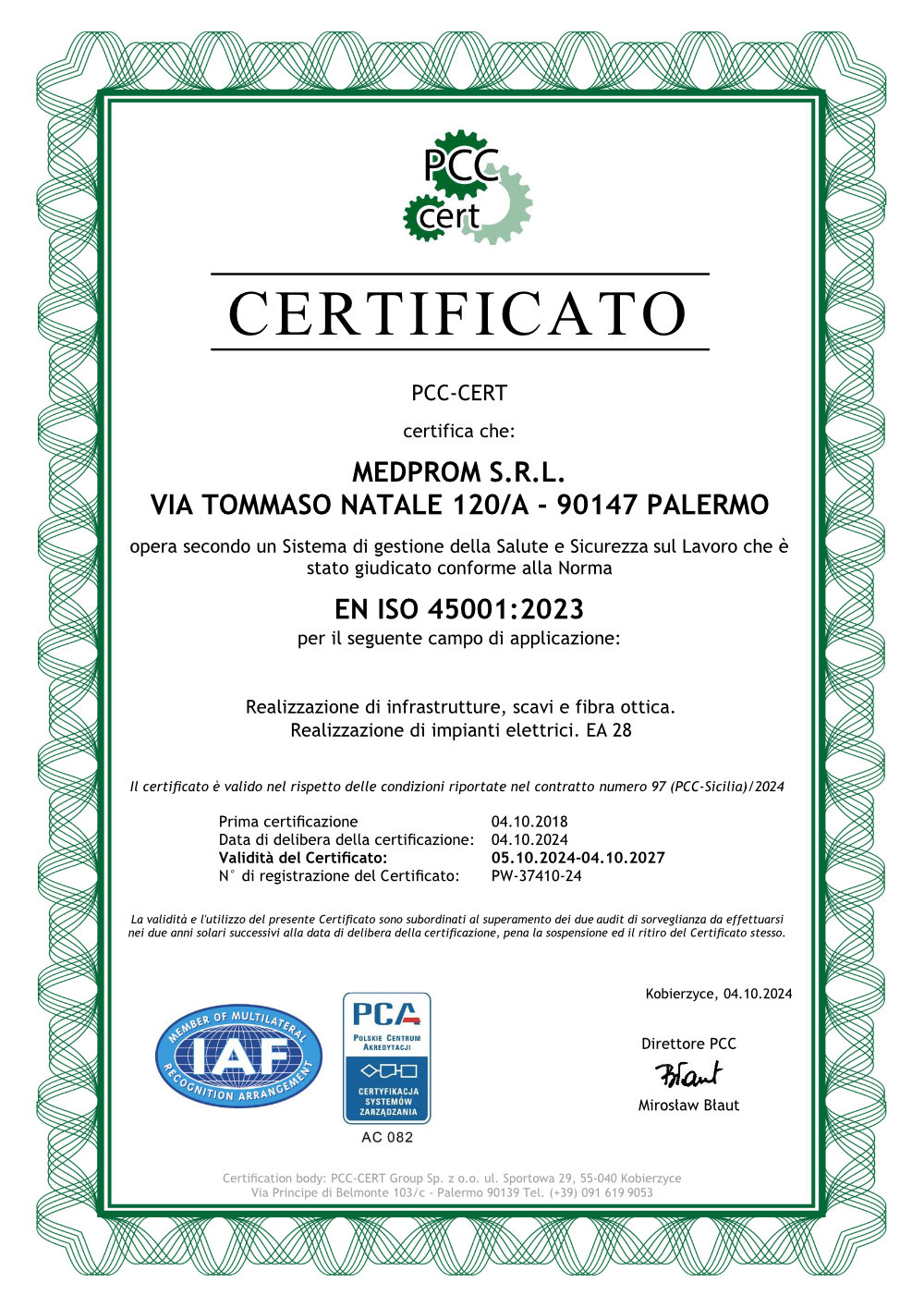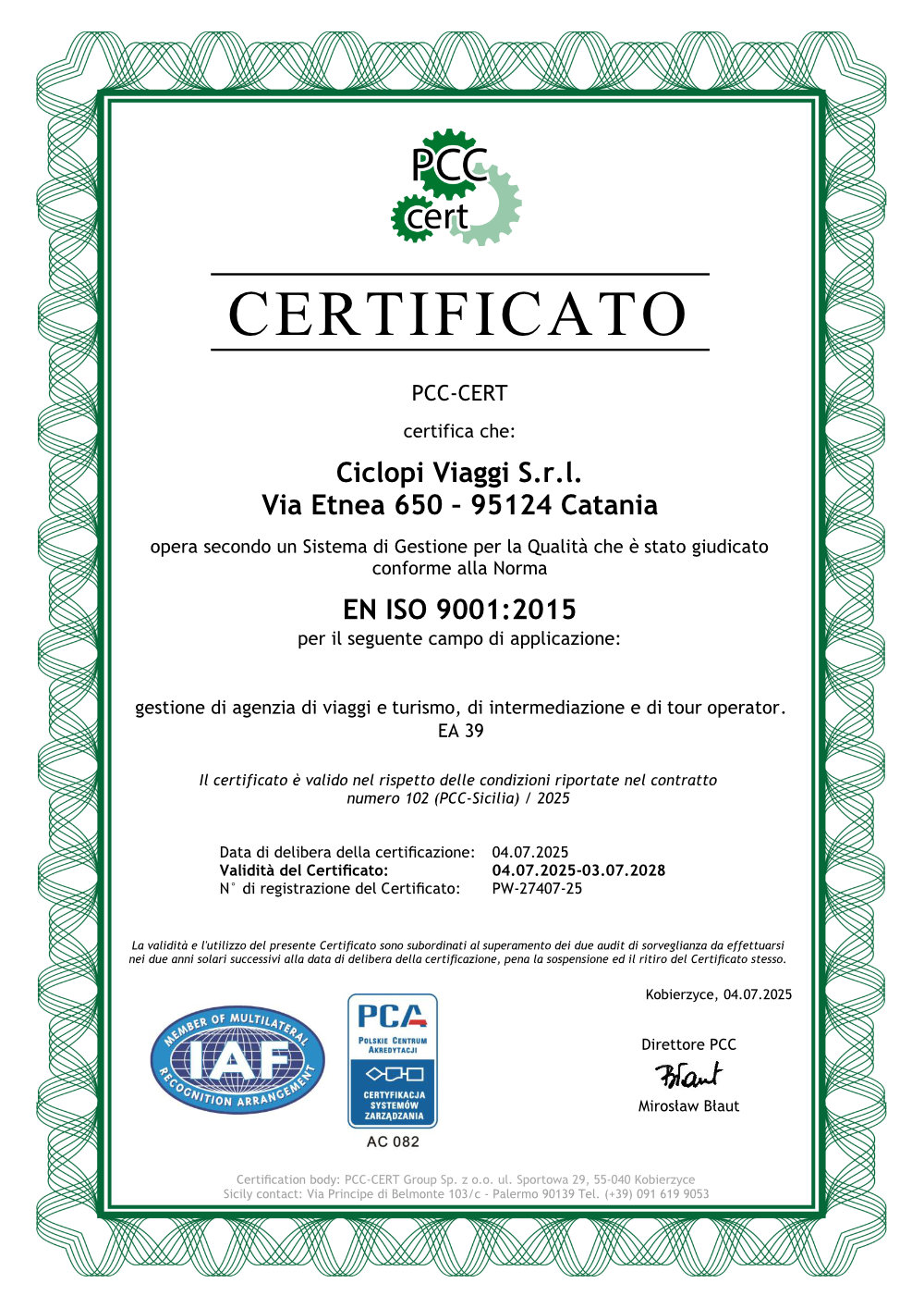 La nostra sede siciliana, presente a Palermo dal 2019, appartiene al gruppo internazionale PCC-Cert, con sede centrale in Polonia e più di 10 uffici operativi dislocati in tutta Europa. L’appartenenza ad un grande gruppo internazionale ci garantisce un know-how che, unitamente alla profonda conoscenza del mercato italiano, ci rende il partner ideale per acquisire ogni tipo di Certificazione.